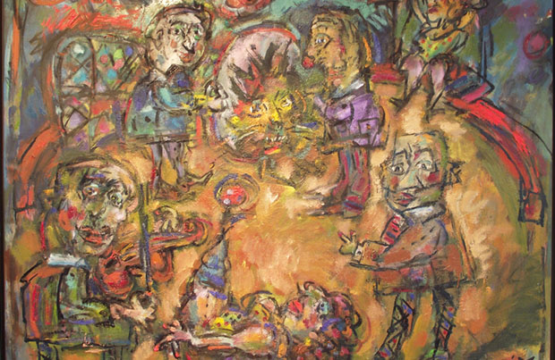 Nézzék meg a színes vibráló, villódzó képeket közelről, aztán távolról összehúzott szemmel, s különös dolgokat fognak tapasztalni. Közelről minden és mindenki csúfondáros, kicsit bolond, fura és egyedi, a helyek és a helyzetek pedig abszurdak: első látásra nem tudjuk pontosan, hogy kerül az a bizonyos szimbolikus csizma az asztalra. Közelről egy csúnyácska, kinevetett, gyarló világ tűnik a szemünkbe, ahol semmi tekintély, semmi emelkedettség, semmi komolyság, semmi harmónia.